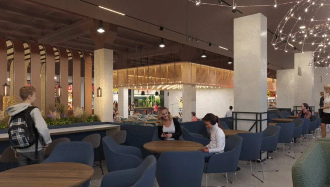 Согласно проекту, на первом этаже общественного пространства расположится фуд-холл, рассчитанный на 25 корнеров. Также на первом и втором этажах будут работать рестораны, которые будут интегрированы с арт-пространством и многофункциональной концертной площадкой.
