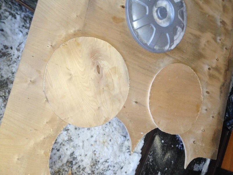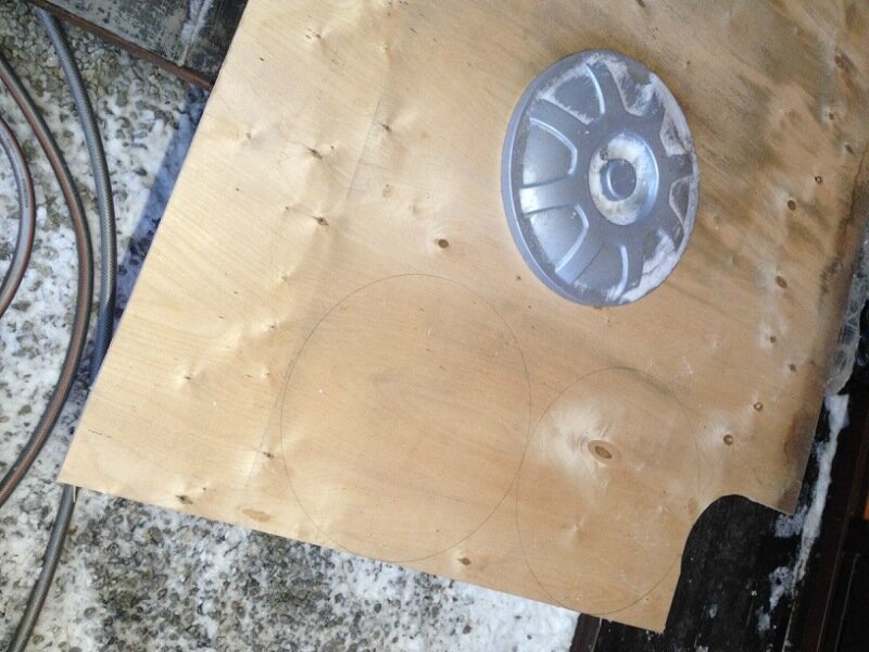 Берем фанеру толщиной 12мм и крышку от ведра. Рисуем.