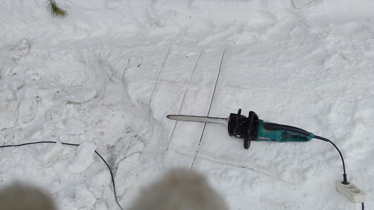 Надо было убрать снег перед гаражом. Сунулся с лопатой — а там полуметровый наст, не угрызешь. Пробовал ломом, тоже не особо получается. Думаю, а чего бы его не спилить? Бензопилу взял и вперед. Способ рабочий оказался. Нарезаю полосками, лопатой отламываю ровные ломтики. И тут же на лопате увожу.