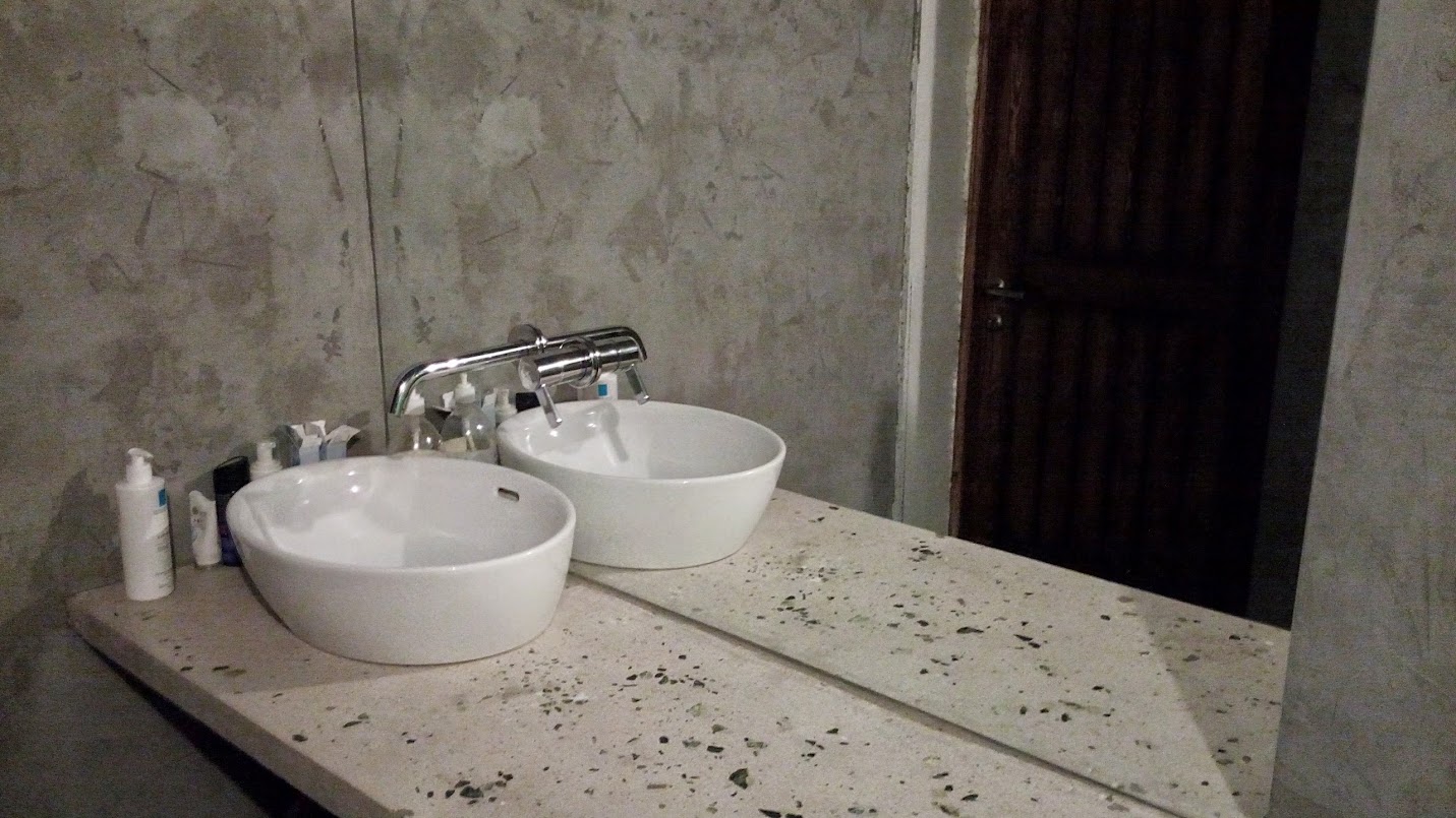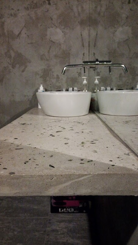 После полировки прошелся пару раз лаком для бетона. Установил раковину и получилось вот так: