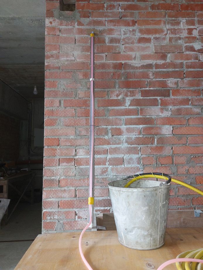 Два китайских лазерных уровня закинул на полку, косячат. Для ответственных работ пользуюсь самодельным гидроуровнем. Один конец шланга опускаем в ведро и крепим жестко без перегибов, к другому концу крепим тонкую прозрачную трубочку 1-1,5-2м , трубочку крепим к рейке с куском мерной ленты 1-1,2м от старой рулетки. Ведро ставим на высоту табурета или стола. Очень удобно работать одному!! (магазинные гидроуровни в топку!)