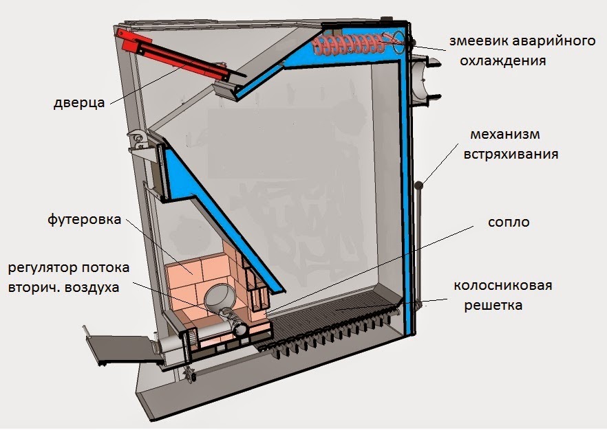 Эффективно осуществляется теплосьем за счет купольной конструкции в камере дожига. Колосники, располагаемые внизу легко снять и вновь установить. При этом, они снимаются и устанавливаются не через загрузочную дверцу, а снизу. Снизу можно вместе с колосником снять и твердые включения (гвозди, камушки и пр.).