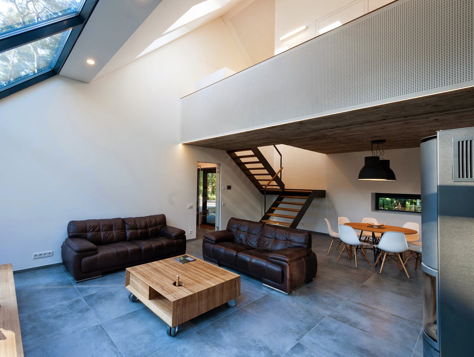 С виду одноэтажный, а внутри — двух. И в принципе планировка смелая.