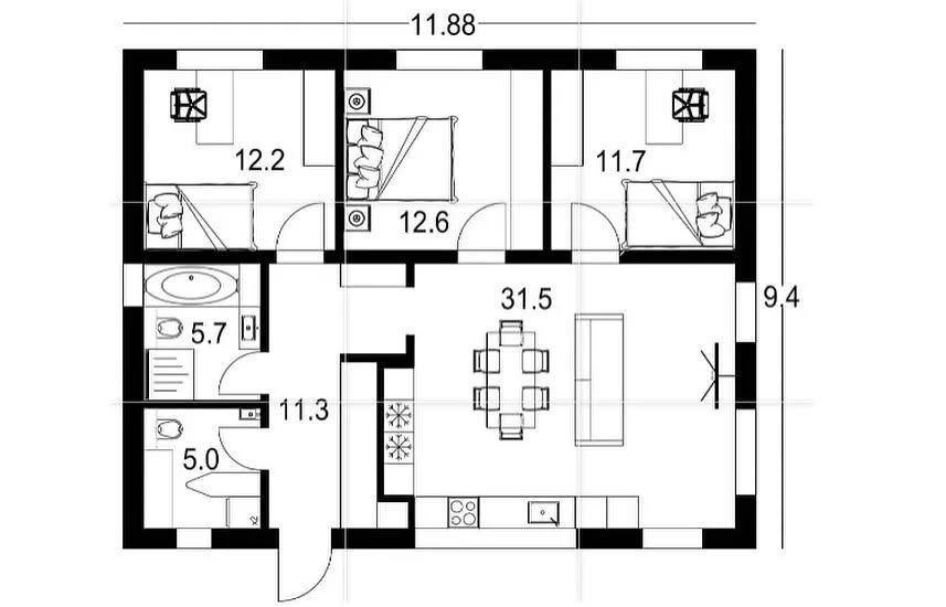 Имеется 3 спальные комнаты по 12,5 кв.м. Ванная комната 5 кв.м., тех.помещение 5 кв.м.