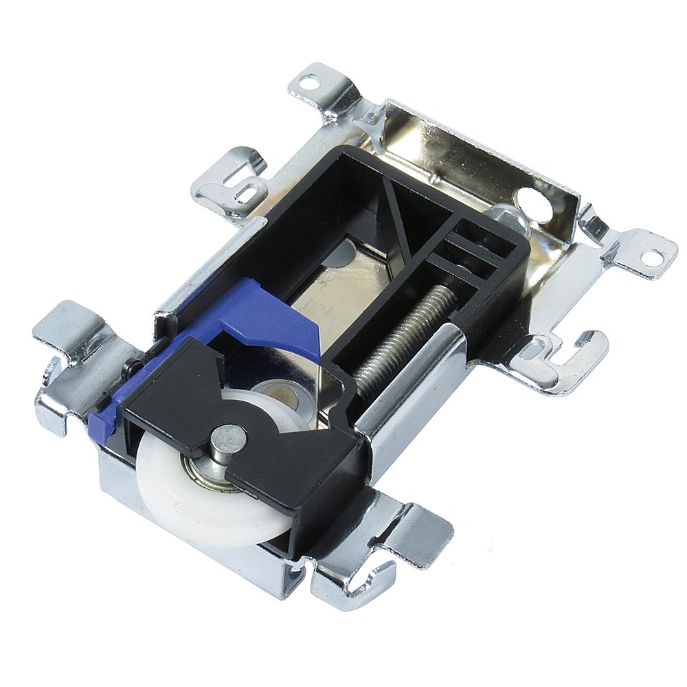 Синий флажок на роликах для шкафа-купе служит для блокирования роликов в нижнем треке. Он позволяет удерживать механизм роликов дверей шкафа нижней направляющей при подпрыгивании или наклоне двери.